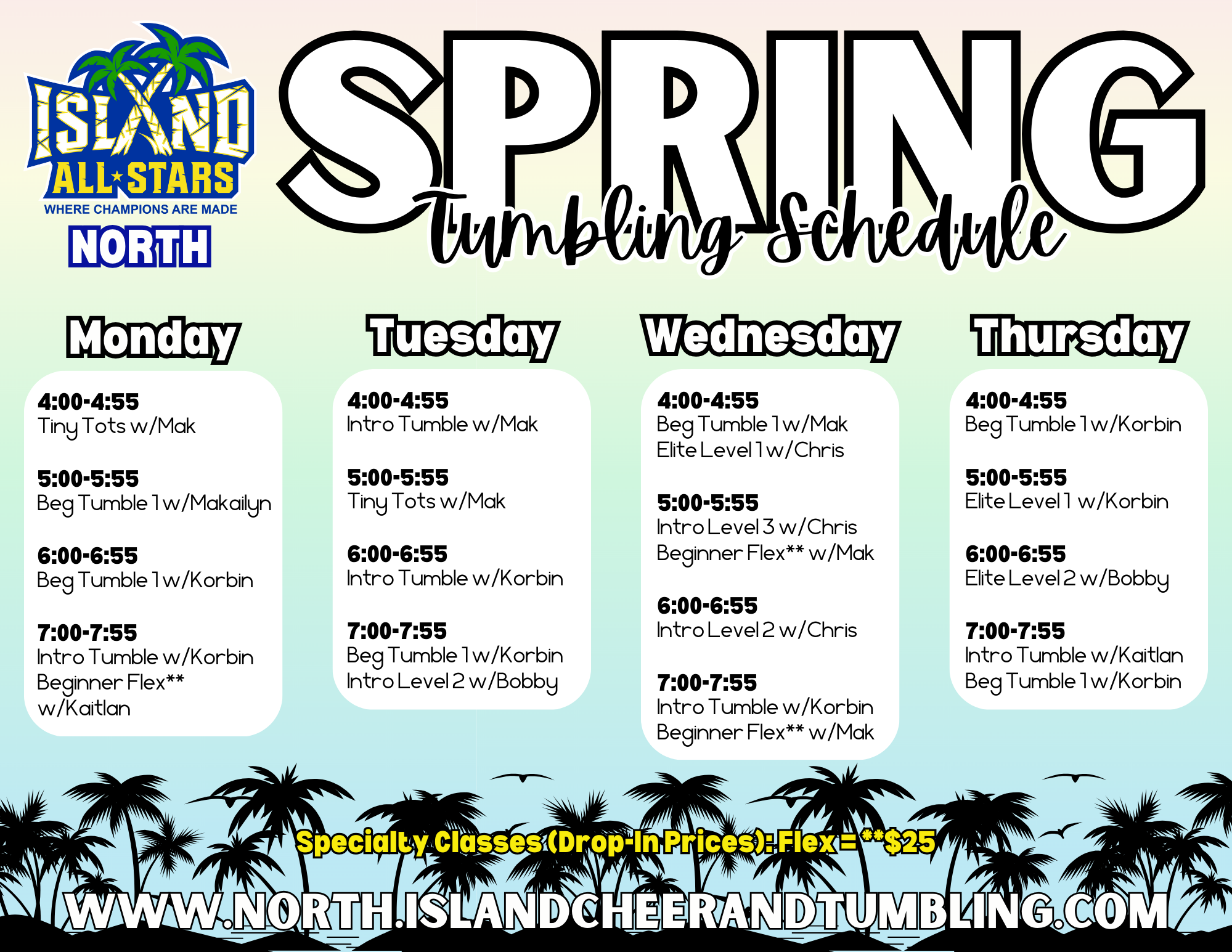 At Island All-Stars North in Nassau County, we offer a variety of tumbling levels & All-Star Cheerleading for ages 3-18. All athletes are placed on teams, regardless of experience.